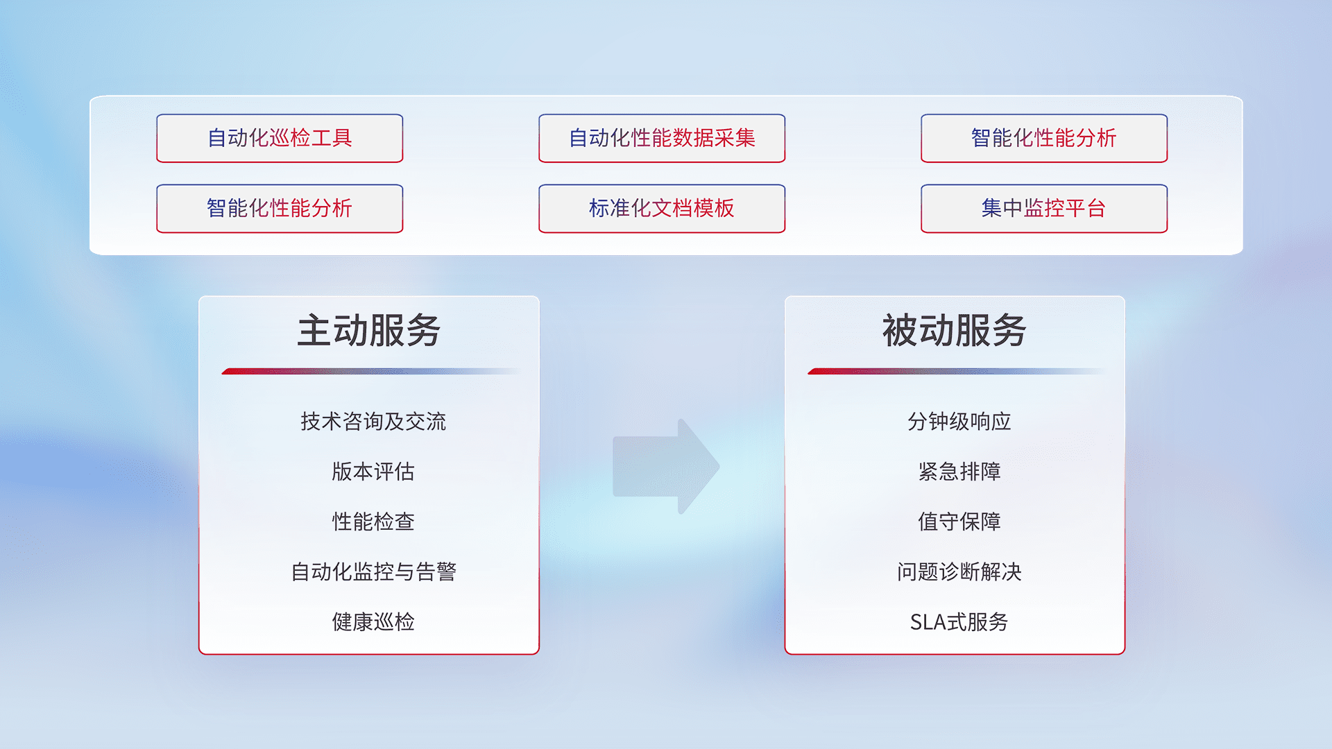 智能化工具和标准化文档,,,,保障服务质量,,,,提供主动服务(包含技术咨询、、、版本评估、、、性能检查、、自动化监控与告警、、、健康巡检)和被动服务包含(分钟级响应、、、、紧急排障、、值守保障、、、问题诊断解决、、、SLA服务)。。